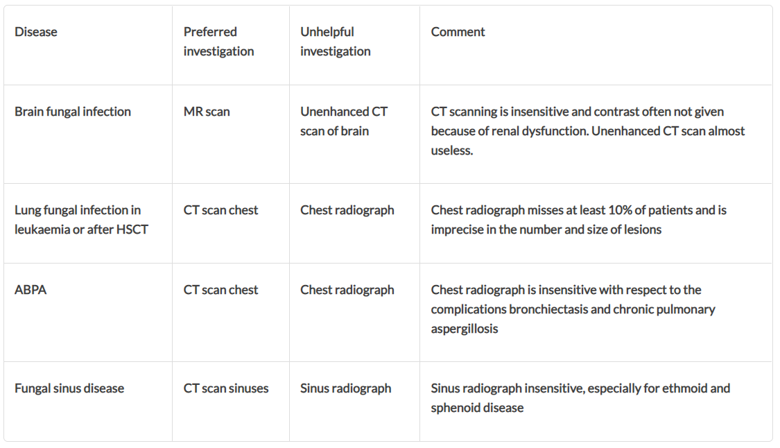 Imaging is an important part of diagnosing and monitoring fungal infections, especially when combined with mycological evidence. For good reviews with lots of informative images please see: