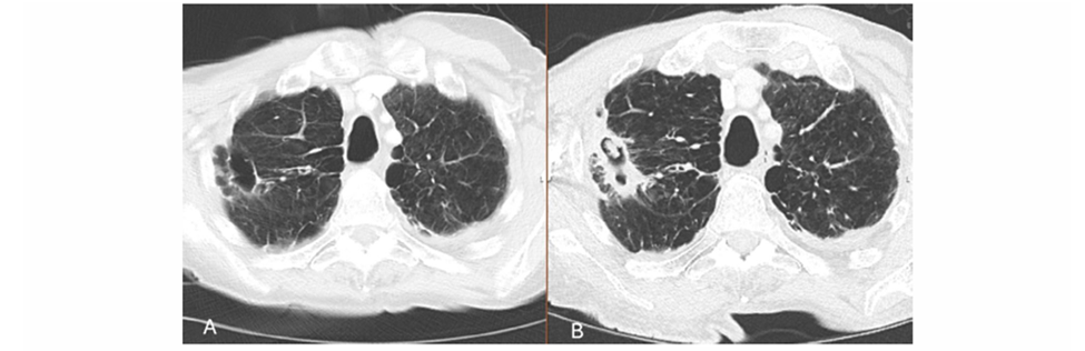 (B) Un año después de haber suspendido el tratamiento antifúngico, la TC muestra reaparición de bolas fúngicas dentro de la cavidad, engrosamiento de las paredes de la cavidad y consolidaciones pulmonares adyacentes.